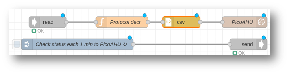 PicoAHU ma możliwość pracy z dostępnymi rozwiązaniami obsługującymi IoT np Red-Node – poniżej przykładowy Flow pobierający cyklicznie dane a następnie umieszczający je w bazie danych gdzie mogą zostać zwizualizowane