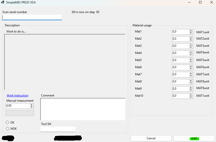 At OP1, material MATx is added according to the BOM and the production routing. This production step can be configured either as automatic material consumption or as manual declaration, where the operator specifies how much of MATx was consumed (e.g., glue application).